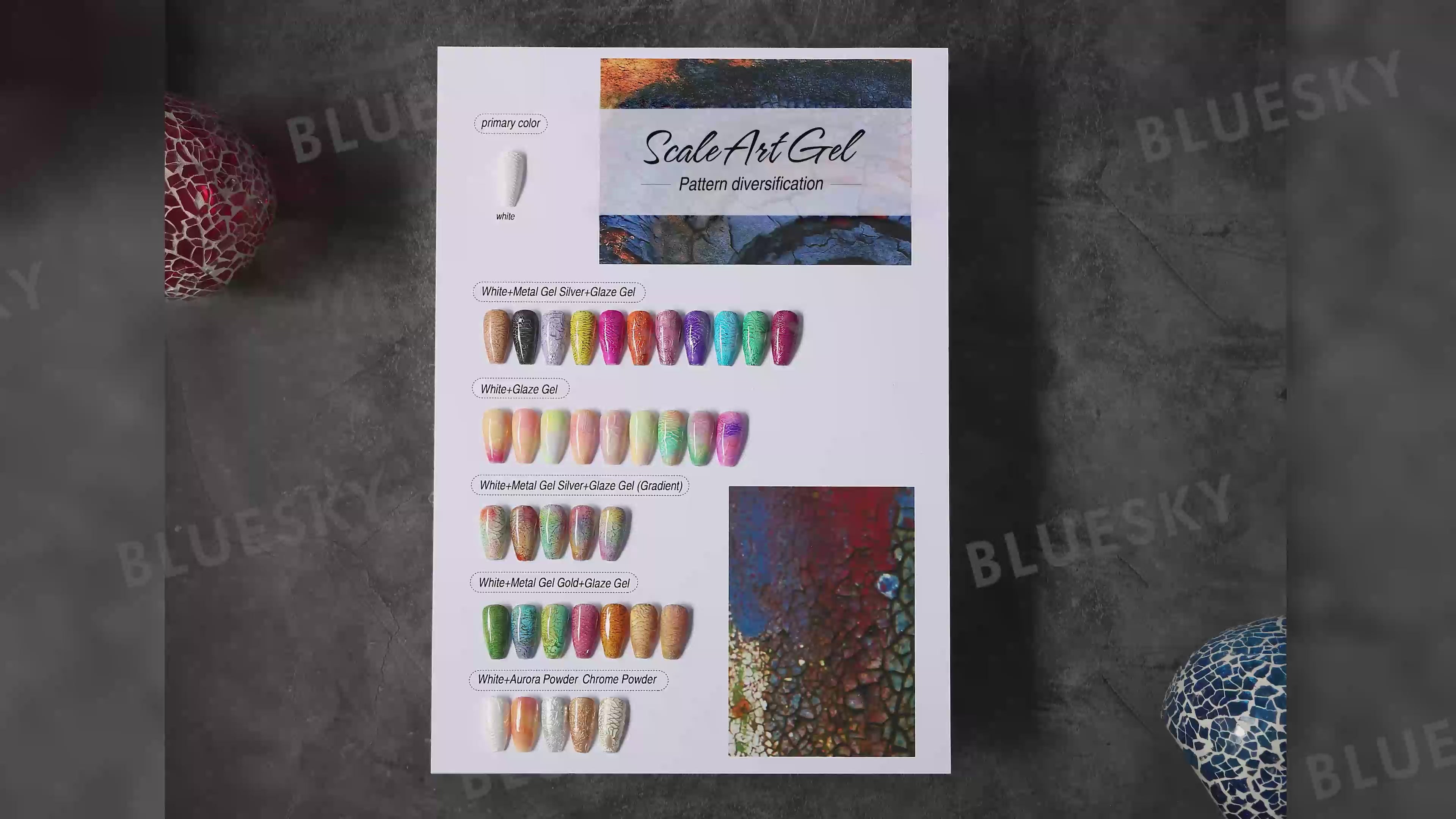 This is a functional application gel for creating bumpy texture such as natural pattern、 fish scales and other patterns. It can be used with Glaze Gel to show the charm of textures; It can also be used with Metal Gel, Aurora Powder, Chrome powder etc. to create other nail art with different effects.