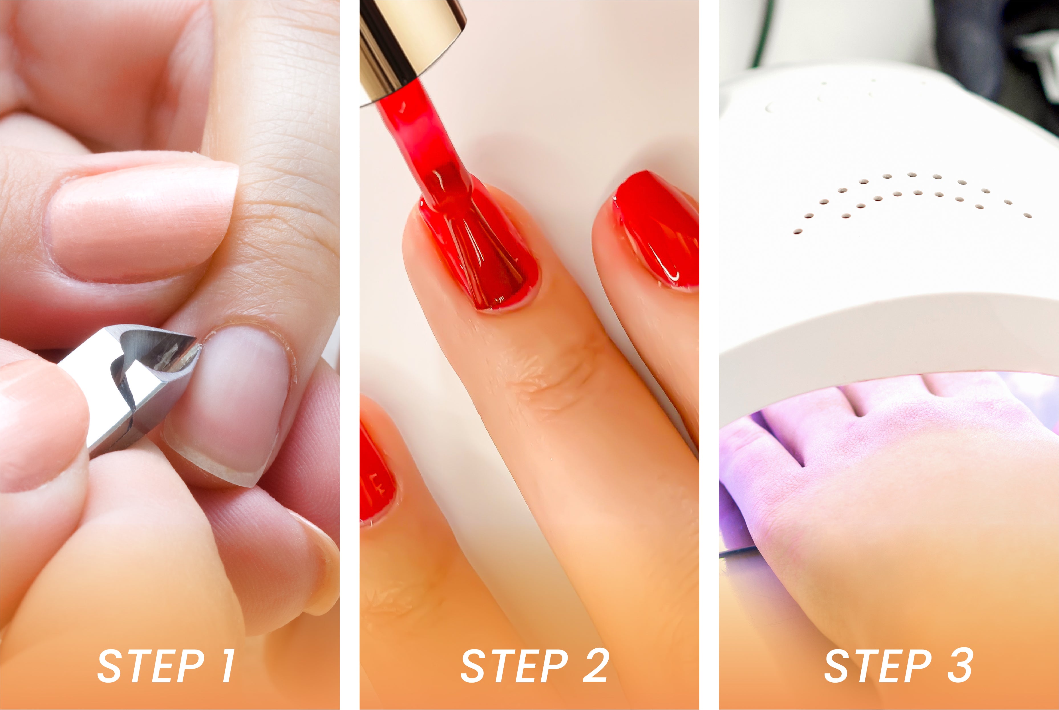 - Cure the nails under a lamp. Repeat steps 2 and 3 applying thicker layers until you achieve the desired coverage.